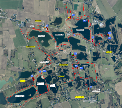 Luftfoto af Tarup-Davinde området med ridestier markeret med rød streg.