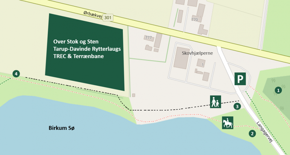 Parkering med hestetrailer på Langagervej 1, 5220 Odense SØ ved siden af Hundeskoven (1). Ridning til banen foregår på grusstien (2) langs søen. Gangstien (3) er forbeholdt fodgængere. Indgang til banen (4).